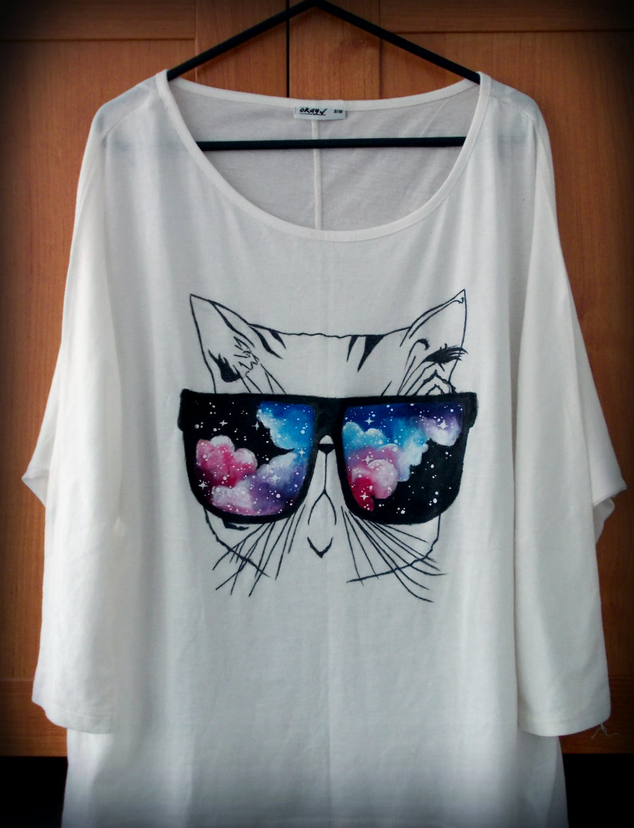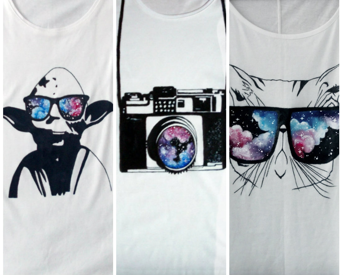 Masa koncertów i festiwali. Co robię w ramach oszczędzania? Lecę za miesiąc do Londynu :D Tyle w temacie tego "co u mnie". U moich malunków trochę zastoju, ale powracam znów. Dziś wstawiam trzy koszulki. Jedną najnowszą (kot), drugą najstarszą (aparat) a trzecią "po środku" (Yoda)