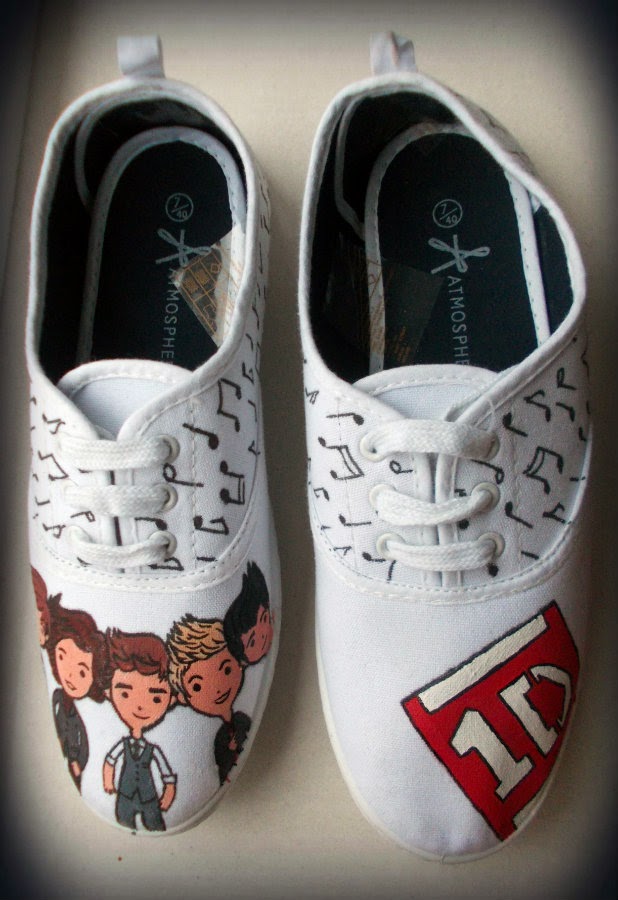 Z muzycznych rzeczy ostatnio malowałam...tenisówki z One Direction xD Nasz klient, nasz pan. Przedstawiają się tak: